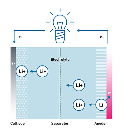 Lors de la charge d'une batterie lithium-ion ou d'accumulateurs lithium-ion, les ions de lithium sont transportés de la cathode à l'anode à travers la couche d'électrolyte. Dans l'anode, qui est souvent constituée de graphite ou d'autres matériaux riches en carbone, le lithium est stocké de manière réversible en absorbant des électrons. Lors de la décharge de la batterie, ce processus s'inverse. La couche anodique riche en lithium cède des électrons et les ions de lithium qui en résultent sont transportés vers la cathode. Le flux de courant qui en résulte peut être utilisé par des consommateurs électriques. Ce cycle peut être répété plusieurs fois dans le cas des batteries, mais certains effets de mémoire sont inévitables. Plus la batterie et les matériaux utilisés, comme le phosphate de fer et de lithium, sont de haute qualité, plus la durée de vie peut être élevée.