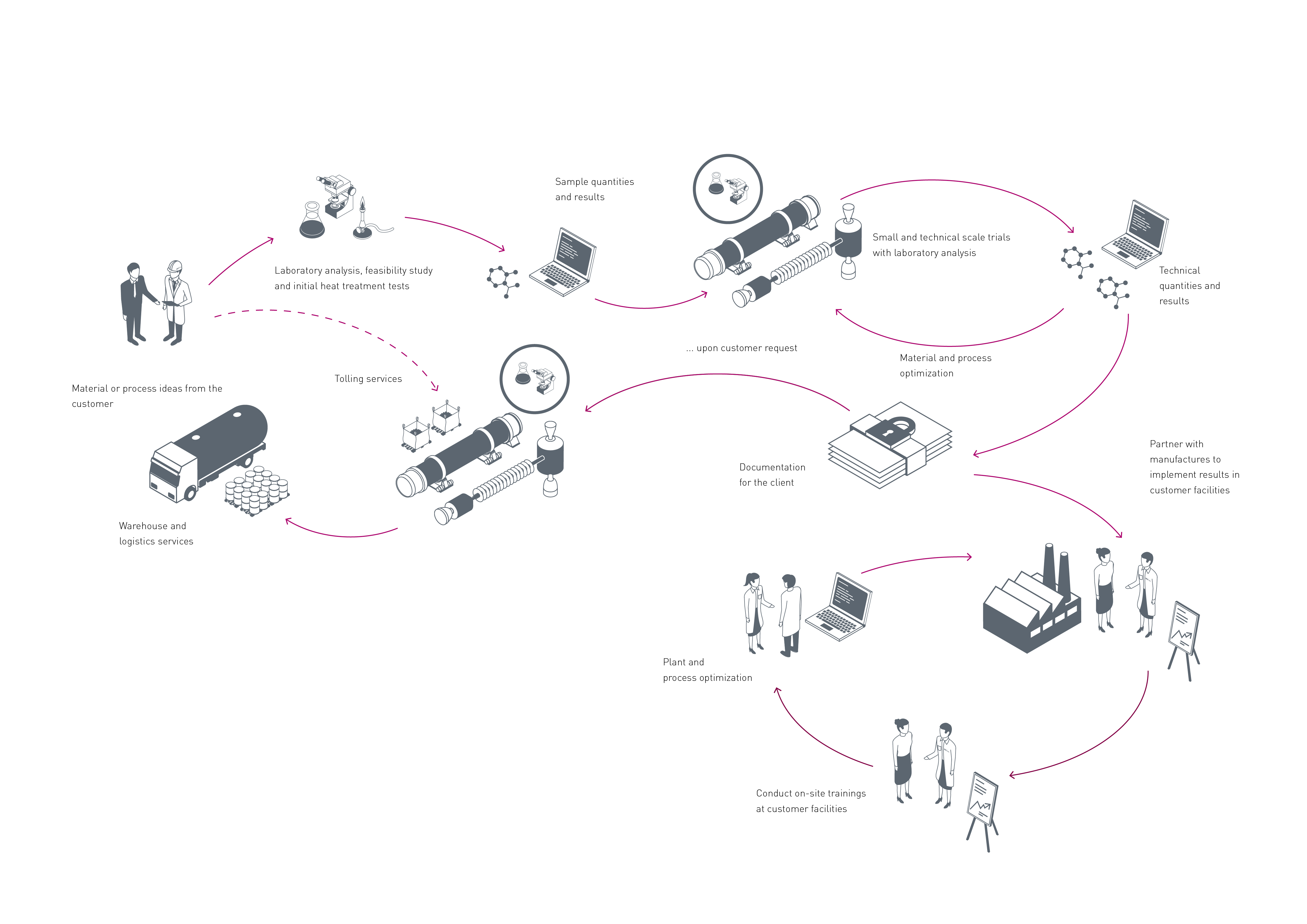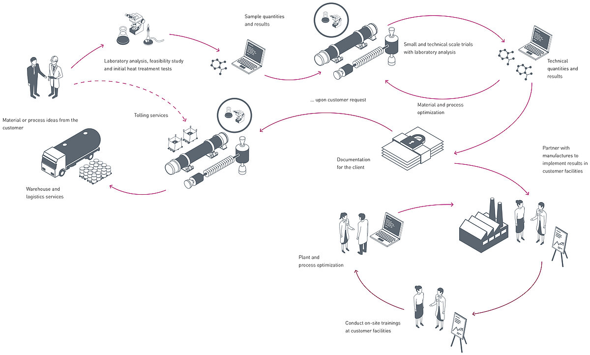 Vous serez conseillé de façon personnalisée en fonction de vos besoins, tout au long du cycle de vie de votre matériau: du développement à la production, en passant par l’optimisation de vos installations. En outre, nous aidons nos clients à résoudre les nombreux défis auxquels ils font face au-delà des limites de notre portefeuille, qu’il s’agisse d’expérimentations sur des étapes de traitement thermique, de recherche spécialisée, de conseil ou de formation. Nous vous proposons des solutions, dès lors que vous avez besoin d’assistance technique.