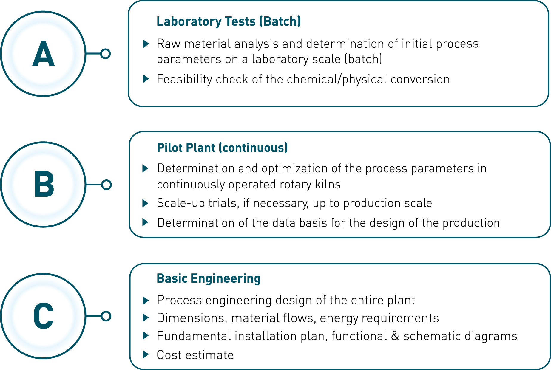 Dans nos centrales pilotes, les paramètres du processus sont déterminés en fonctionnement continu et, dans l'idéal, déjà transférés à une petite centrale de production industrielle. Vous recevrez des données essentielles sur le processus en continu dans le four rotatif, qui serviront plus tard en tant que référence pour l'ingénierie de base.